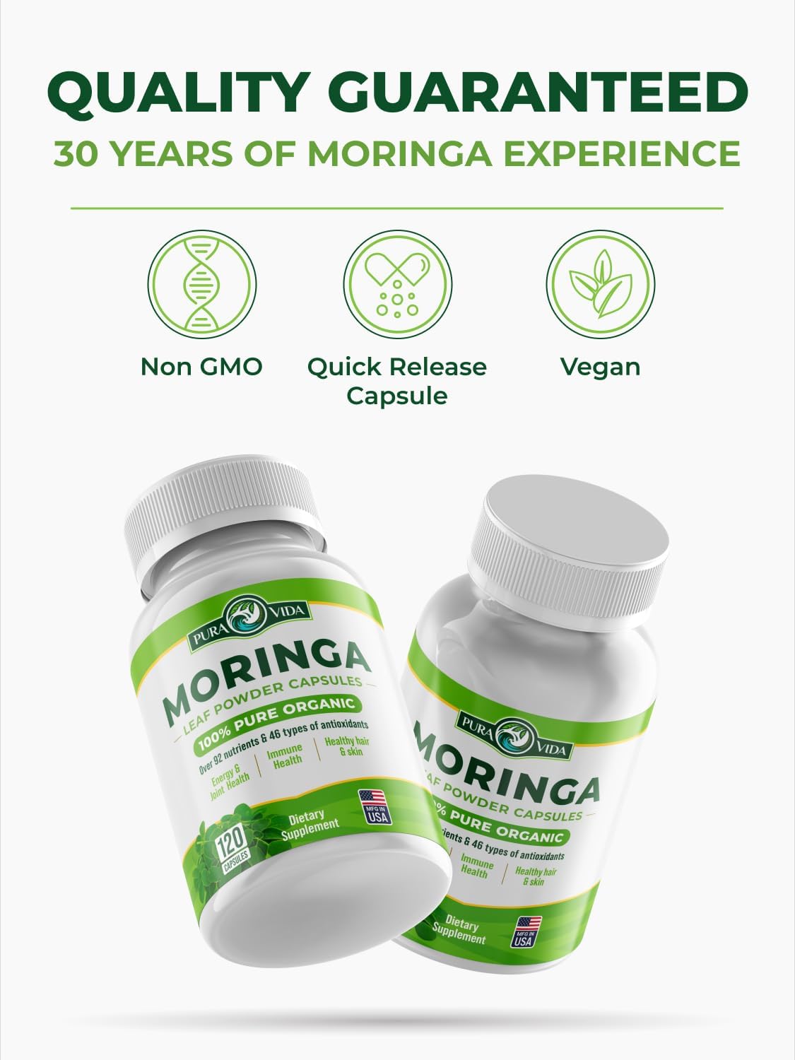 High-potency 800mg dose of pure moringa powder per capsule